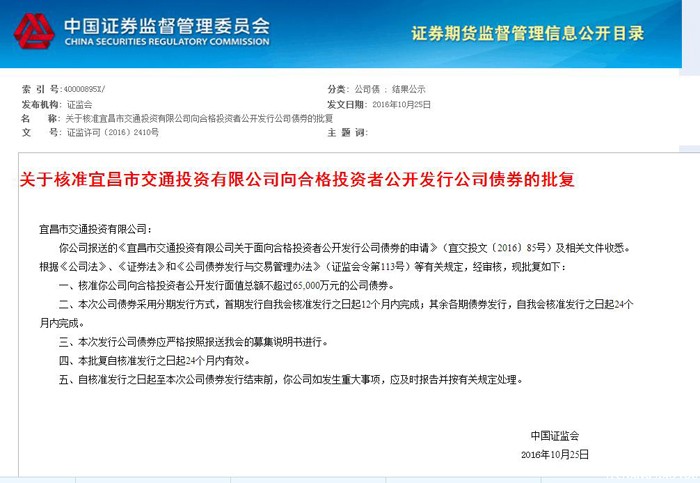 2016年10月25日,筆者從中國證券監(jiān)督管理委員會獲悉,根據(jù)中國證監(jiān)會證監(jiān)許可【2016】2410號《關(guān)于核準(zhǔn)宜昌市交通投資有限公司向合格投資者公開發(fā)行公司債券的批復(fù)》文件,交投公...